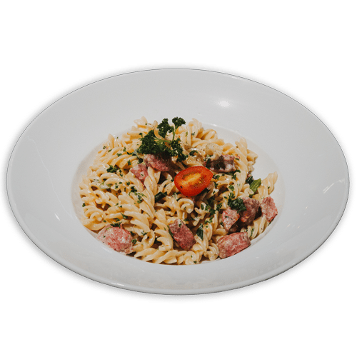 Sauce mit italienischer Wurst, gebräunt mit Lauchzwiebrln, Petersilie, Knoblauch, frischer Sahne Grana Padano Dop. Handgemachte, hausgemachte Sauce